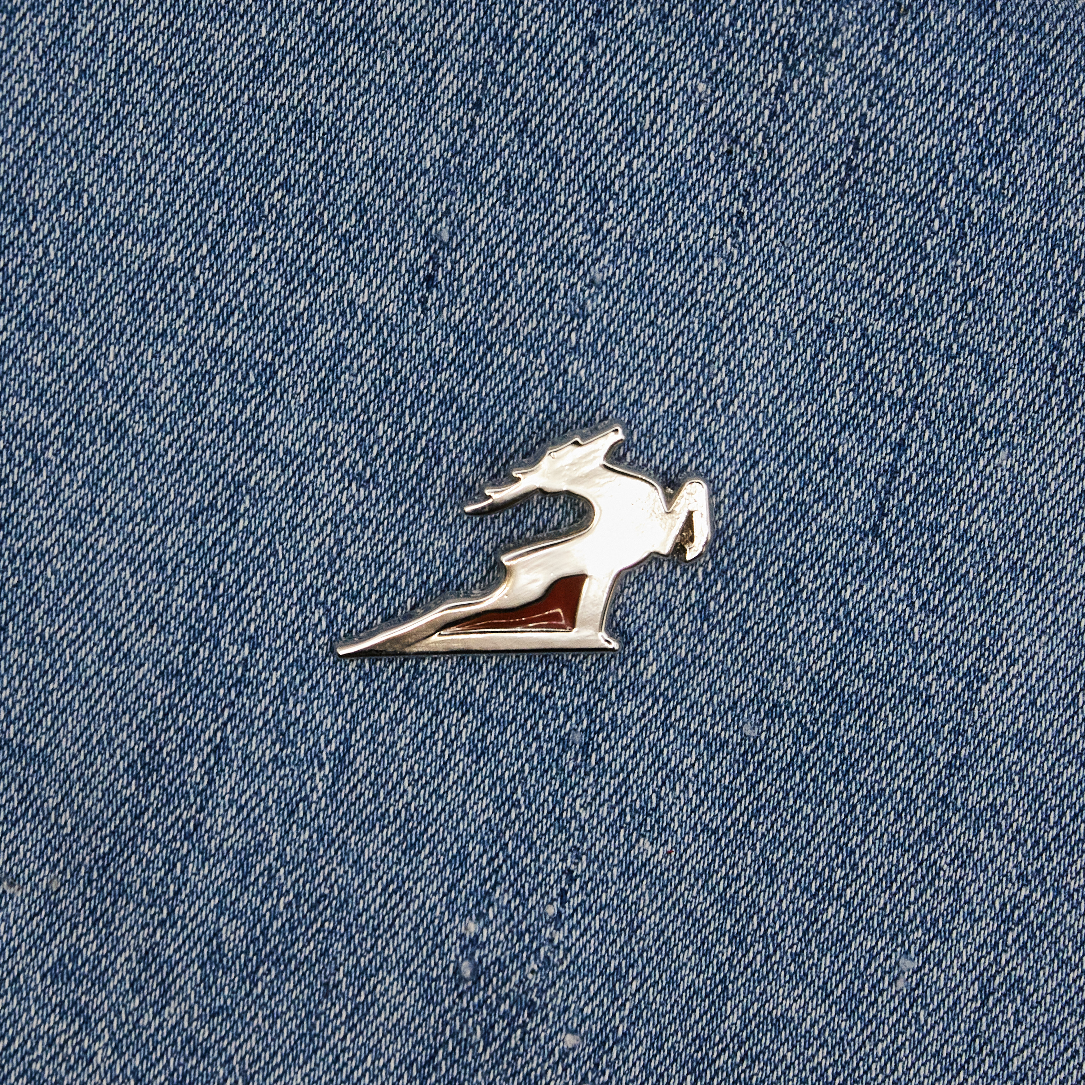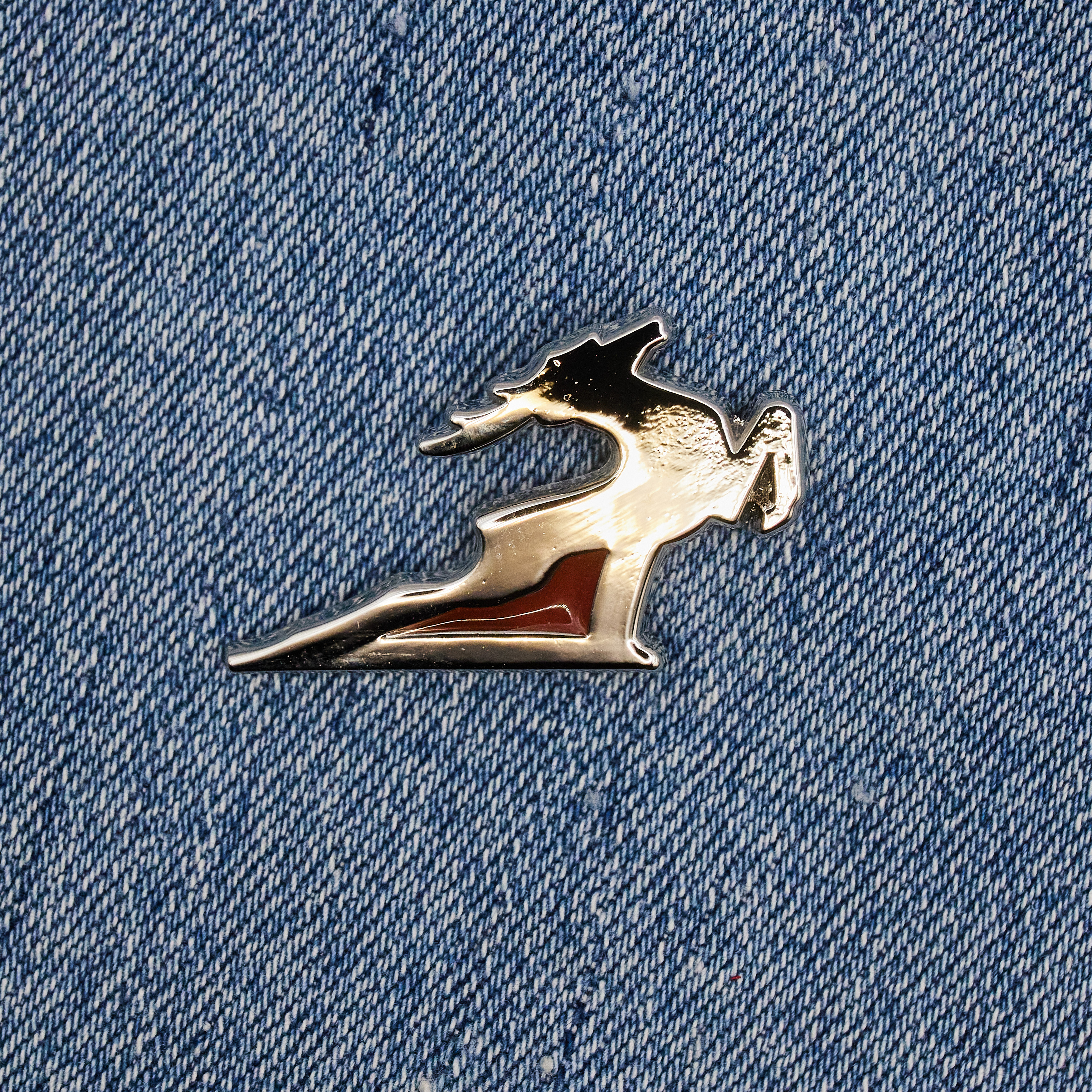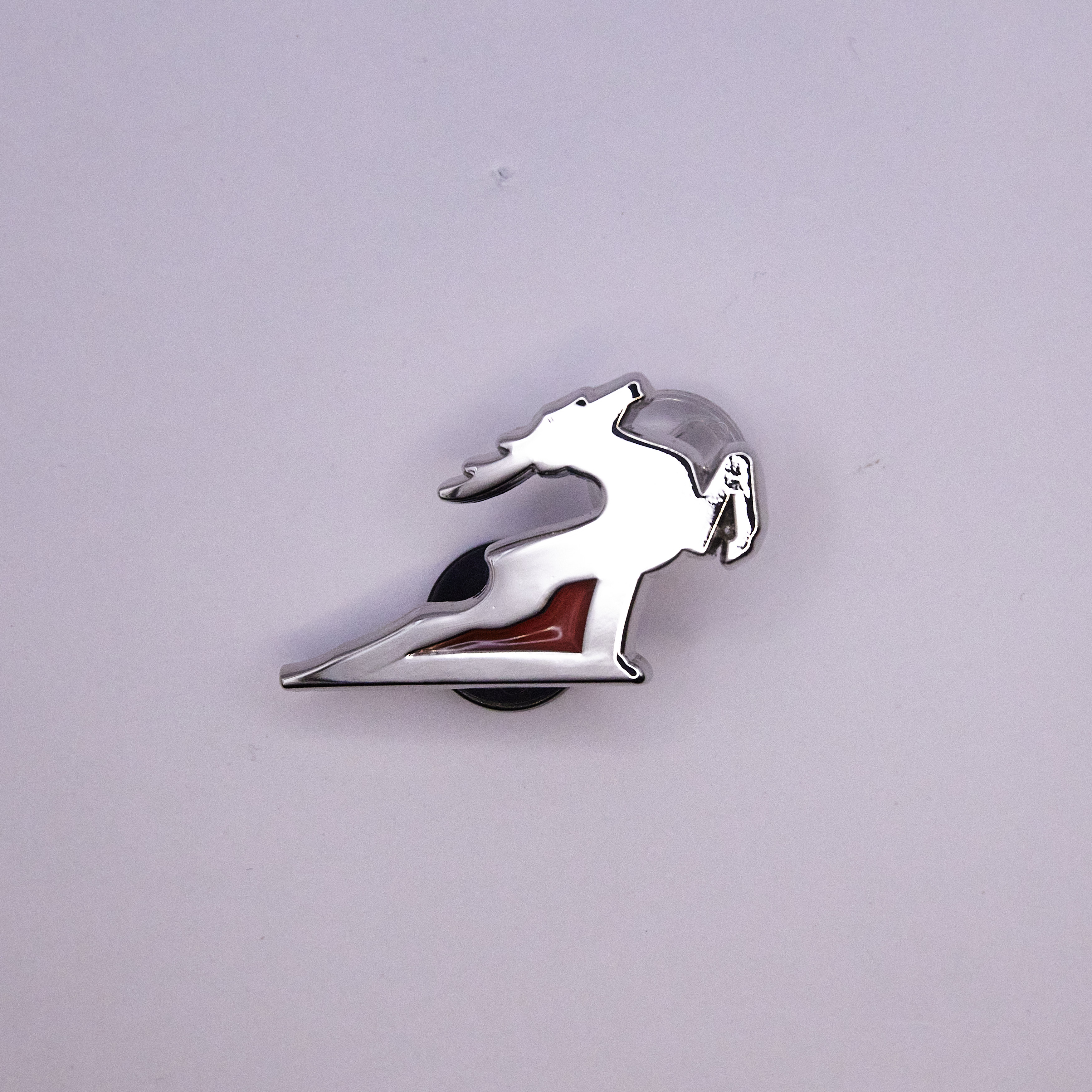 Олень изображен в движении вперед, он символизировал высокую скорость движения автомобиля. Фигурки были отлиты из металла со стеклянной вставкой. Наш значок стилизован под эту фигурку и тоже содержит прозрачную красную вставку.