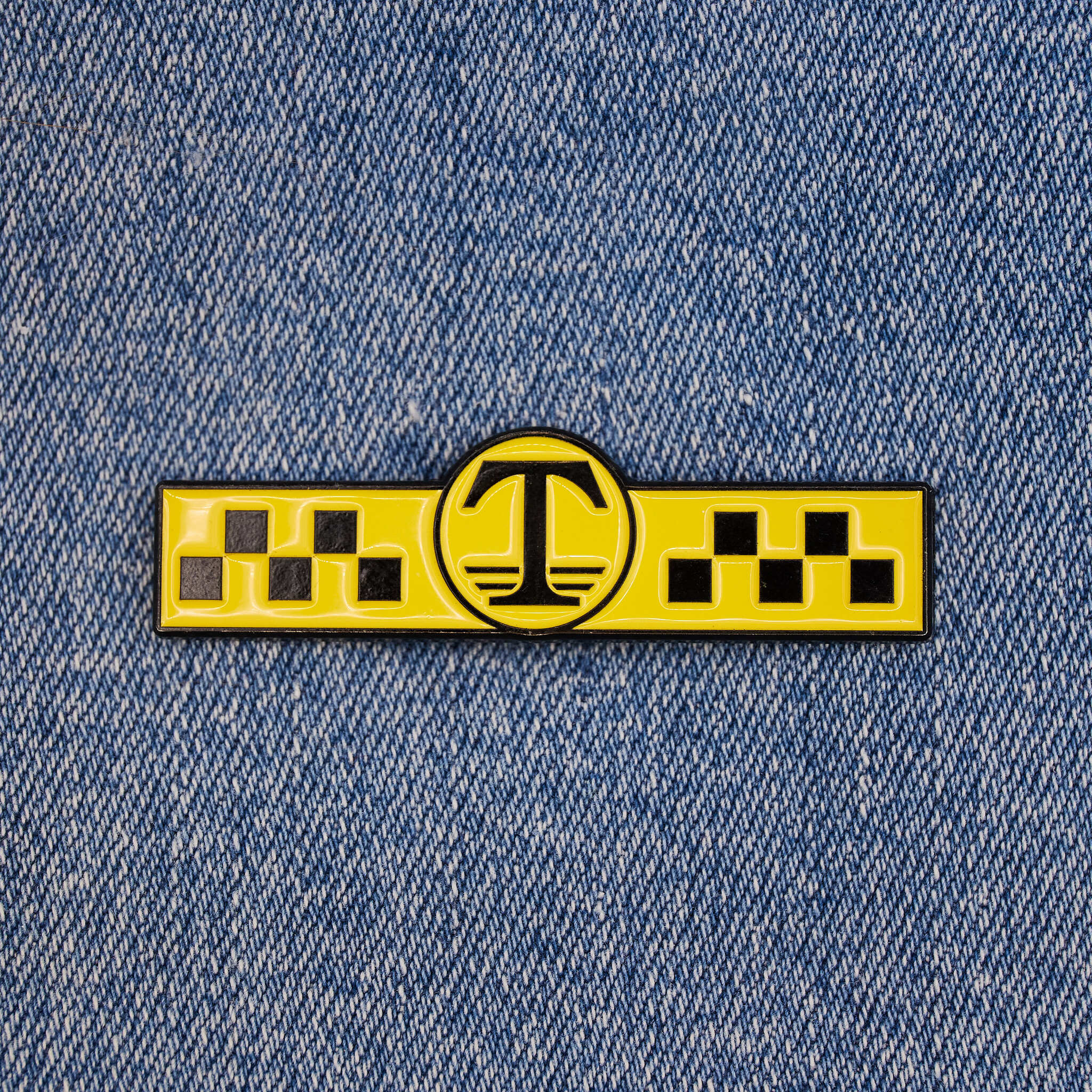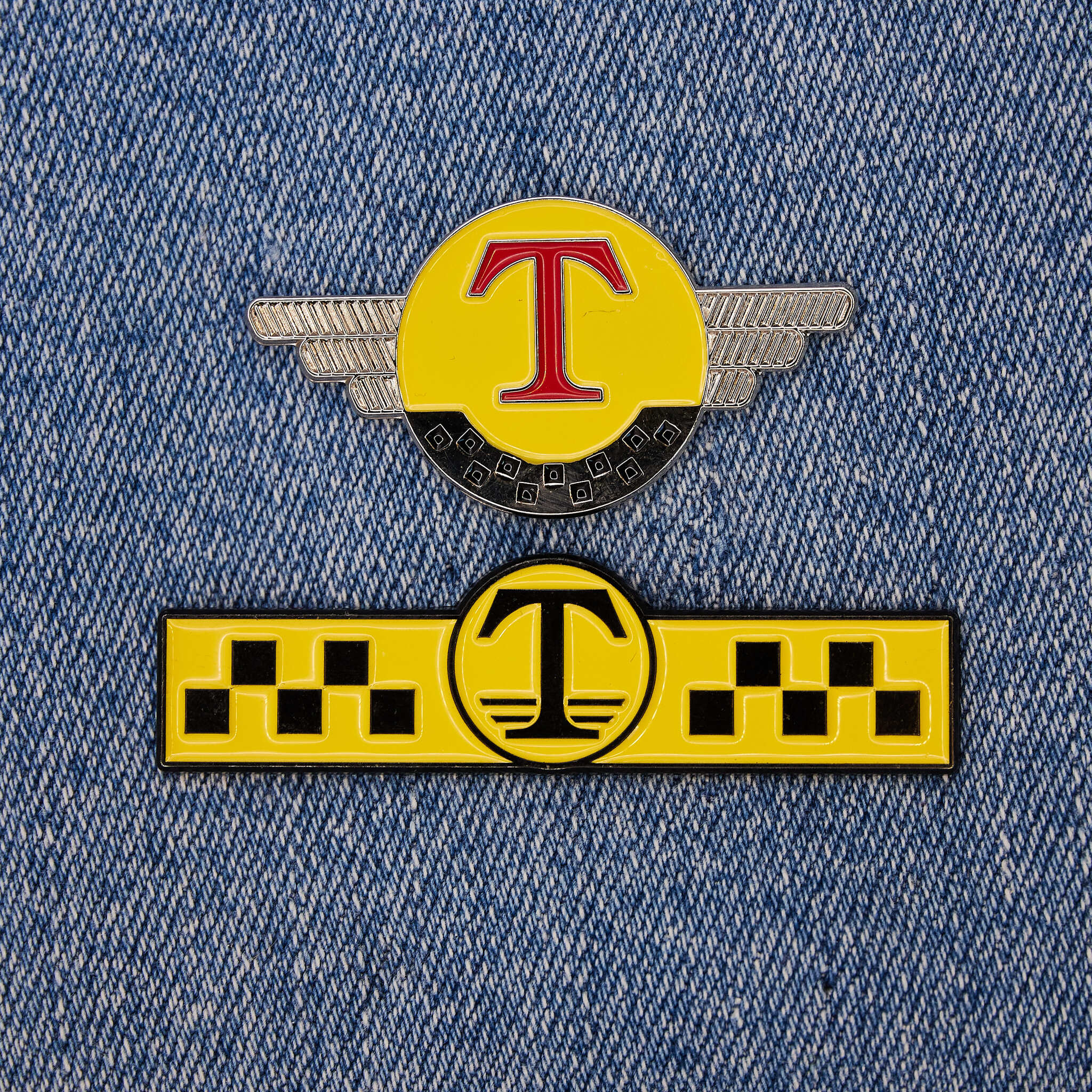 Мы сделали два значка для любителей такси - один вдохновлен форменной кокардой советских таксистов с красной буквой Т и шашечками по кругу, а второй - вдохновлен нанесенными на дверь обозначениями такси.